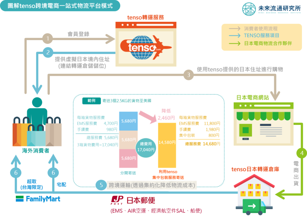 第 2 項為海外直購集貨轉運服務,主要是針對部分消費者認為國際版網站商品種類較少、但缺乏海外地址無法於當地電商網站購物的痛點所開展出的新型態消費。這類型的服務商可透過提供虛擬海外地址等方式,協助消費者直接至海外在地電商網站購物或藉由代購消費後,再將商品集貨轉運回台。海外直購集貨轉運服務的購物程序雖相對繁瑣、且消費者需熟稔當地電商生態,但能夠選購的商品種類豐富許多,而透過業者提供的集貨服務,也能夠降低高昂的跨海物流費用。例如華美集團旗下 SPEX eSHOP 集貨代運網、PChome 集團旗下比比昂,以及日本 BEENOS 旗下代購服務 Buyee 及集貨轉運服務 tenso 等,相當受到消費者歡迎。