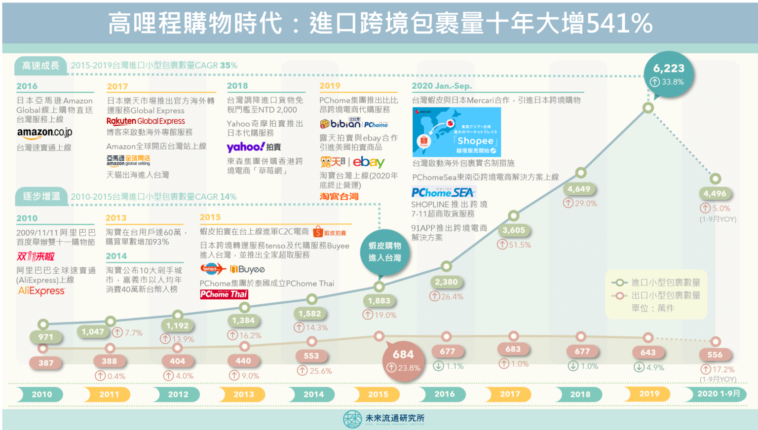 台灣消費者對於海外商品高漲的消費熱情,反映在近 10 年來大幅翻漲的進口小型包裹數量,10 年間由 971 萬件成長至 6,223 萬件,成長幅度高達 541%。尤其 2015 年蝦皮購物(當時為蝦皮拍賣)進入台灣後,進口小型包裹數量自 2016 年起即大幅增加,2015 年至 2019 年間年均複合成長率(